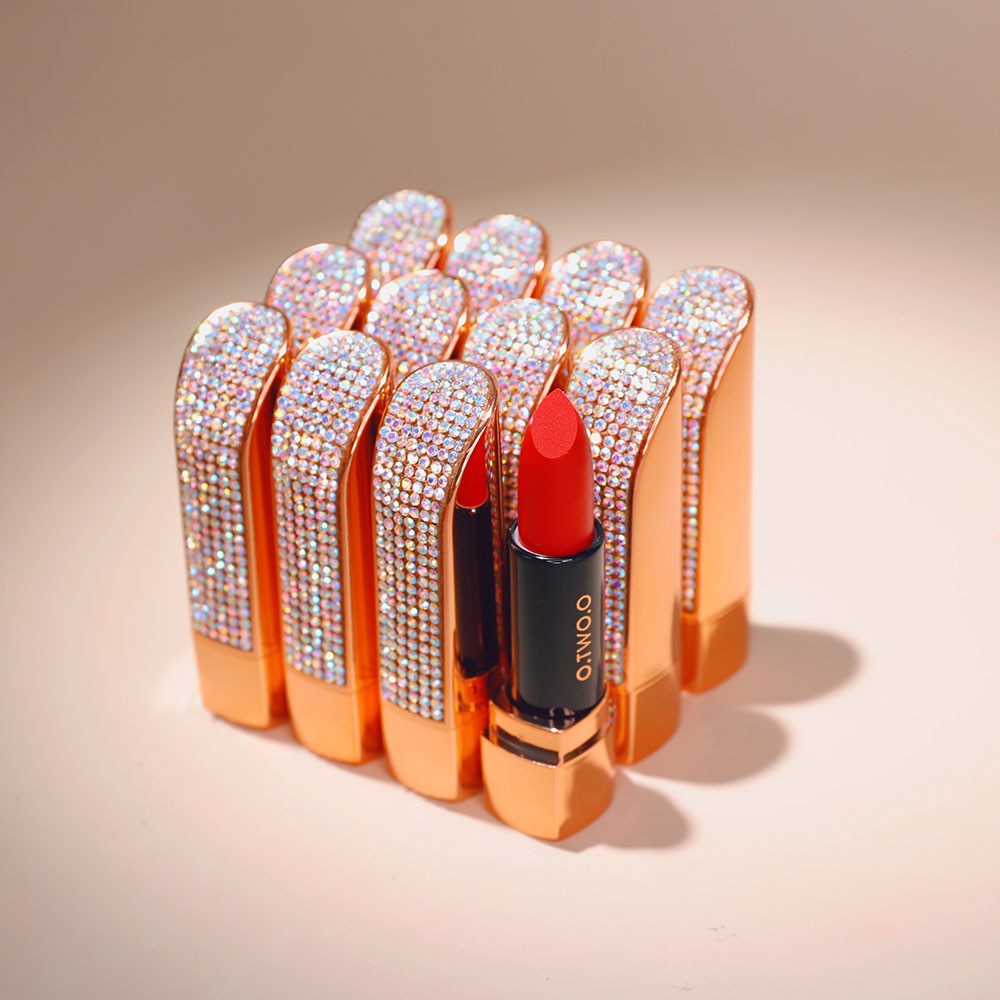 Design luxuoso e brilhante. O design deste batom é muito especial. A embalagem é toda incrustada com strass cintilantes, o que deixa o batom mais luxuoso.